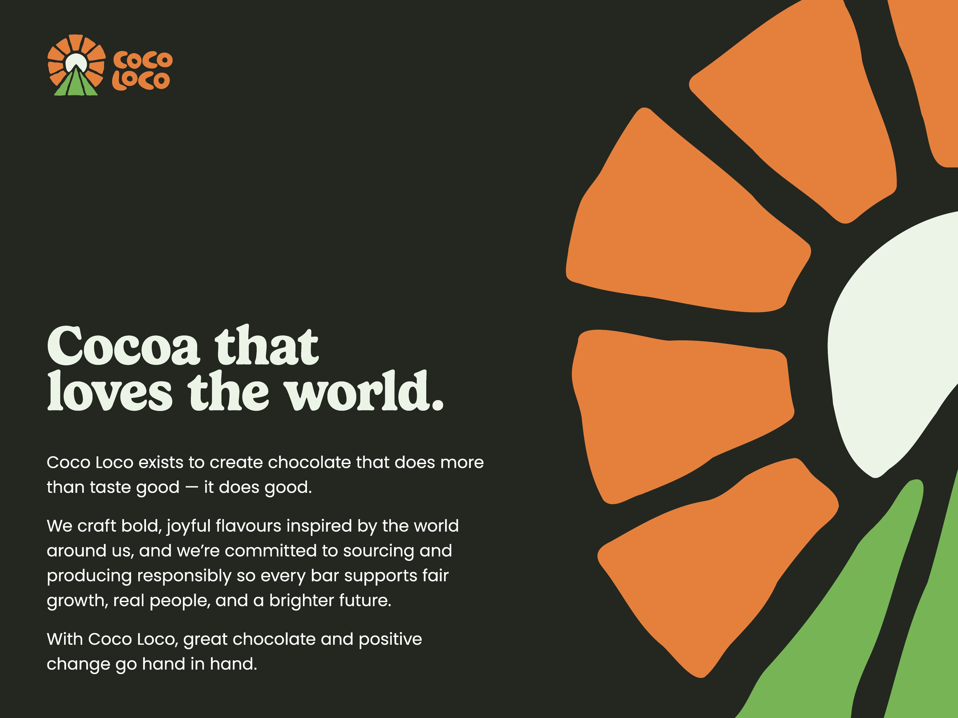 For Unit 9, I developed a complete brand identity for a fictional chocolate brand, Coco Loco, supported by a comprehensive brand guidelines document and bespoke packaging concepts. The project focused on positioning the brand within the mid-range chocolate market, targeting ethically minded consumers aged 20–40.