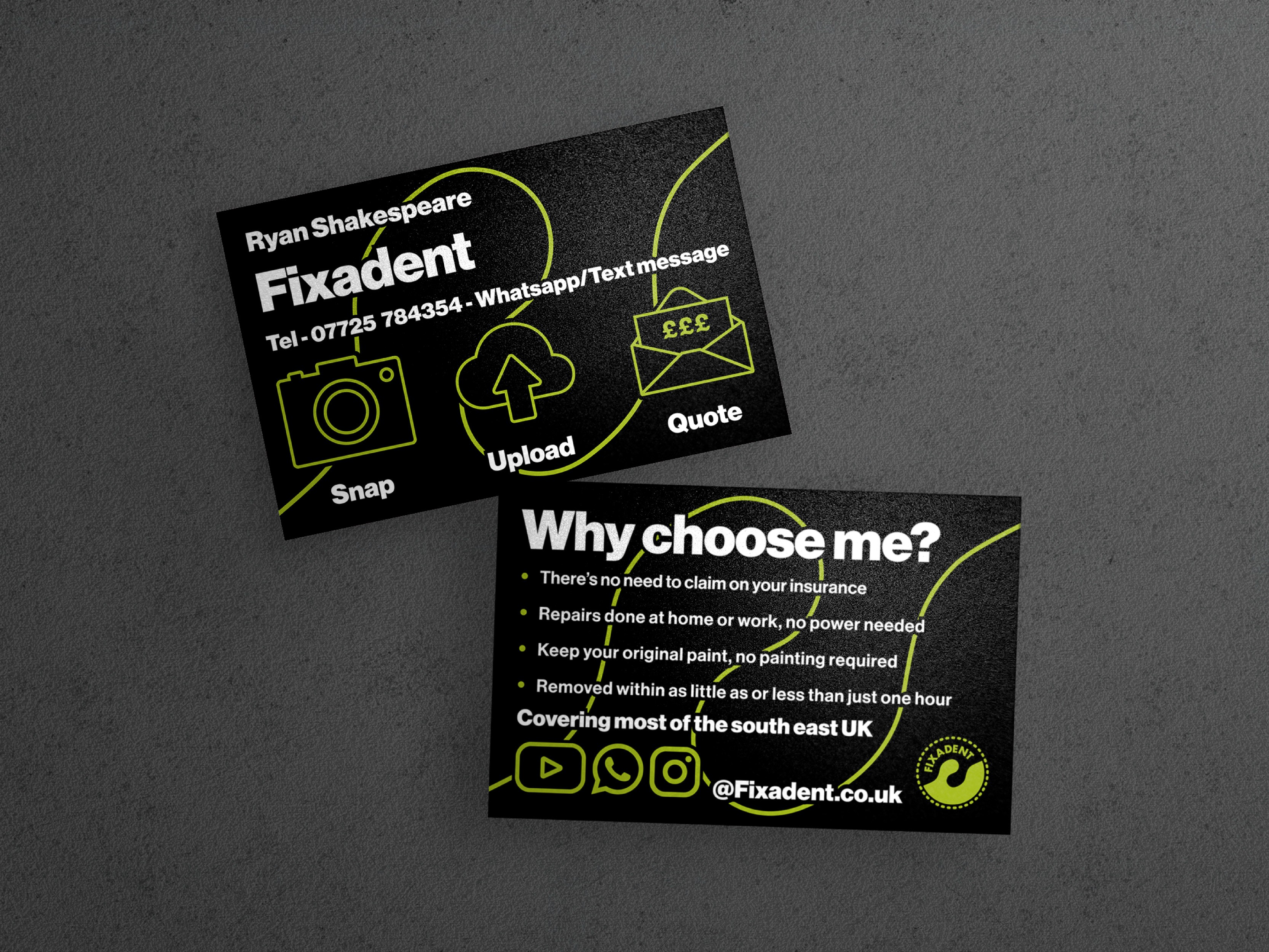 This project involved creating clear and effective marketing materials for Fixadent, a paintless dent removal business. The aim was to improve how the service offering and process were communicated, as the existing flyer design was visually cluttered and difficult to understand. The focus of the project was to simplify the information, improve clarity, and ensure the brand could be applied consistently across print materials. Alongside redesigning the flyer and business cards, the project also addressed technical issues within the brand assets to ensure Fixadent had a professional and scalable visual foundation moving forward.